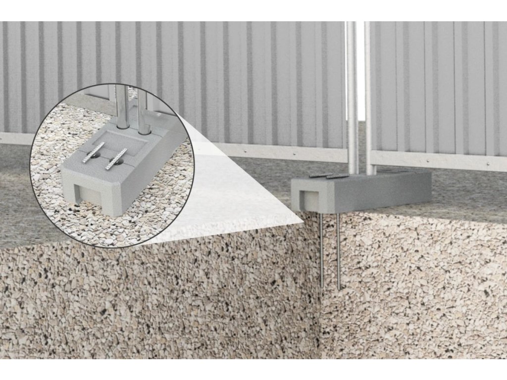 Kolík sloužící k ukotvení betonového nebo plastového podstavce pro mobilní oplocení do hlíny či jiného nezpevněného podloží.