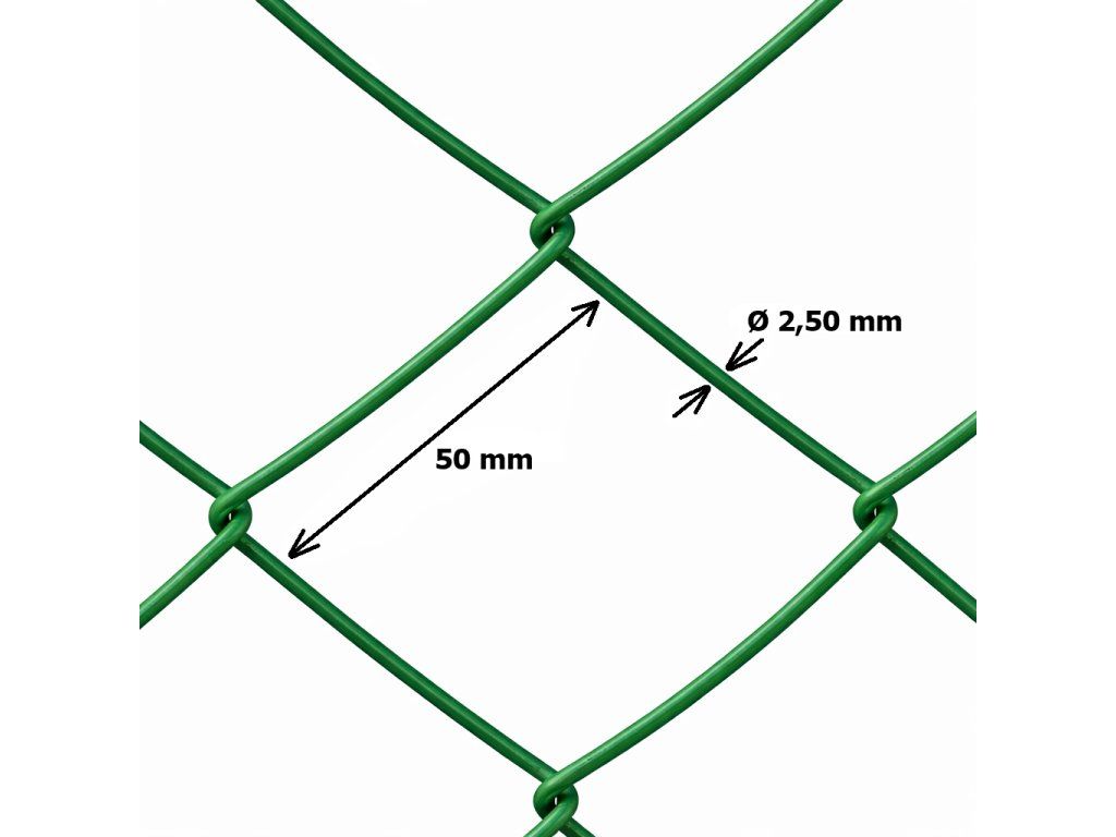 Klasické pletené čtvercové pletivo, velikost ok 50x50 mm, výška 200 cm, tloušťka drátu 2,5 mm. Pletivo je vyrobeno z pozinkovaného a poplastovaného drátu. Barva zelená.