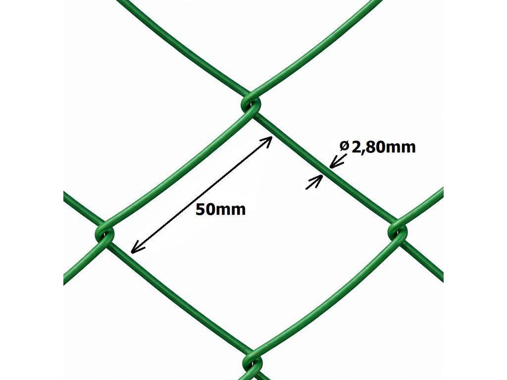 Klasické pletené čtvercové pletivo, velikost ok 50x50 mm, výška 200 cm, tloušťka drátu 2,8 mm. Pletivo je vyrobeno z pozinkovaného a poplastovaného drátu. Barva zelená.