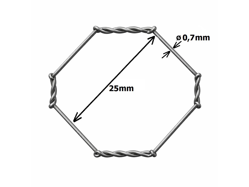 Šestihranné pletivo, velikost ok 25 × 25 mm, výška 100 cm, tloušťka drátu 0,70 mm. Pletivo je vyrobeno z pozinkovaného drátu a následně opleteno.