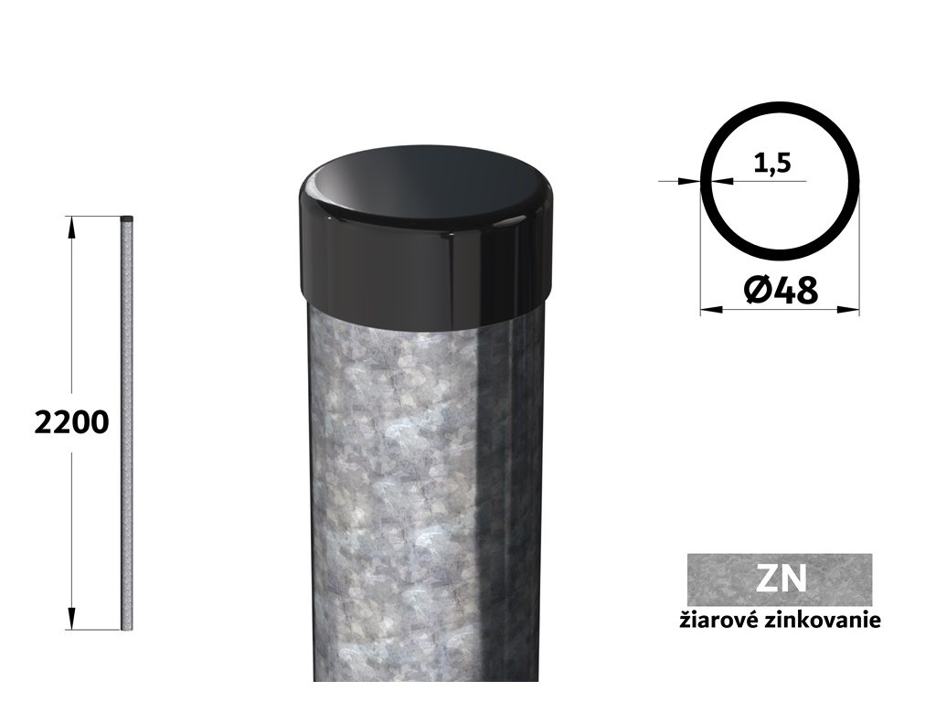 Pro výšku plotu cca 160 cm, celková délka 220 cm, průměr kruhového profilu 48 mm, včetně horního víčka. Žárově pozinkovaný.