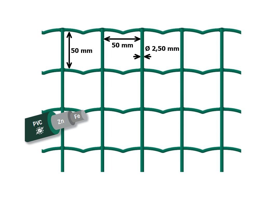 Svařované plotové pletivo, velikost ok 50x50 mm, výška 180 cm, tloušťka drátu 2,5 mm. Pletivo je vyrobeno z pozinkovaného a poplastovaného drátu. Barva zelená.