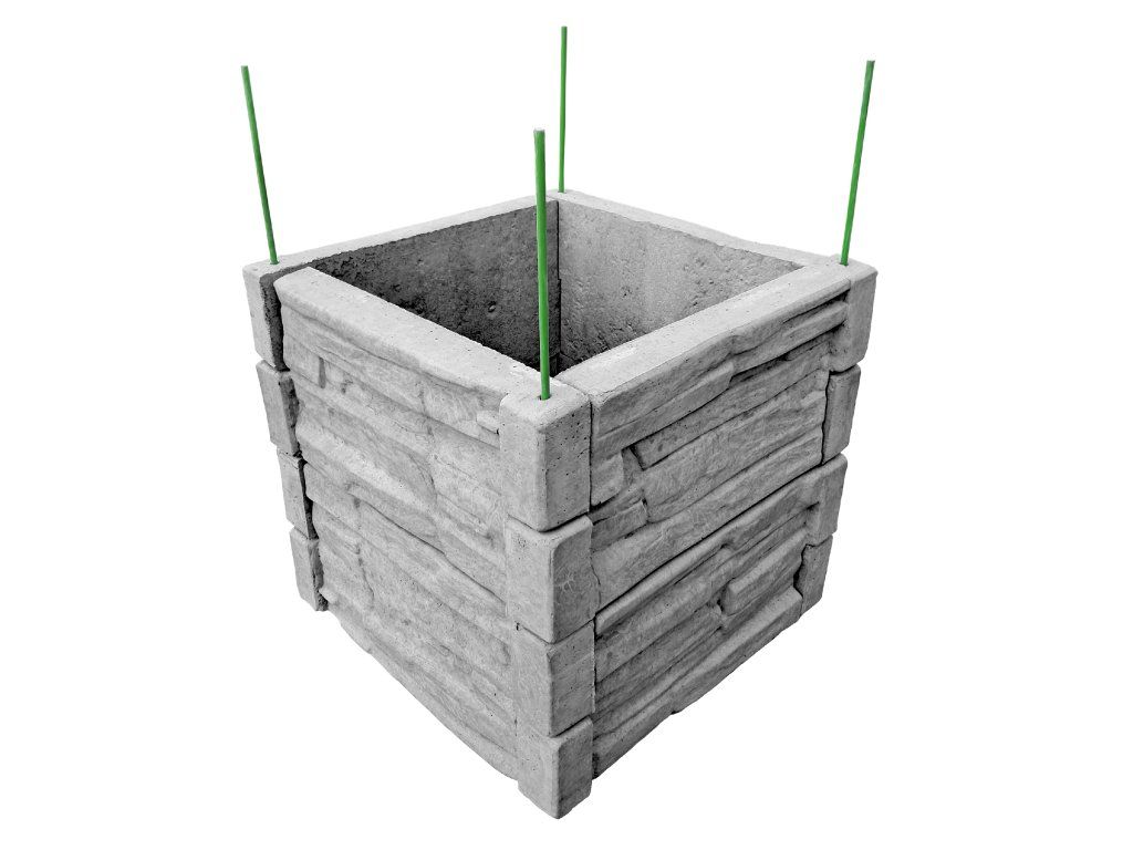Vyvýšený betonový záhon s rozměry 50 x 50 cm na výšku 50 cm se vzorem štípaného kamene v přírodní šedé barvě. Záhon se skládá z 8 ks betonových záhonových desek s rozměry 50 x 25 x 5 cm.